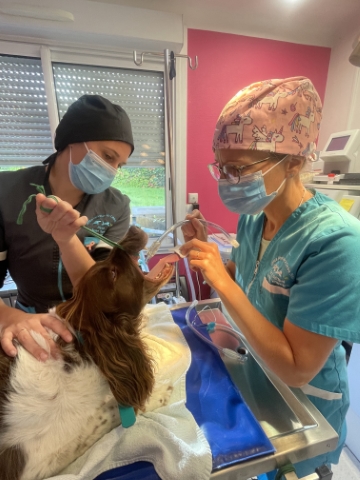 Il est intubé (sonde insérée dans sa trachée) afin de le maintenir sous oxygène et de pouvoir prolonger l’anesthésie avec un gaz si cela est nécessaire